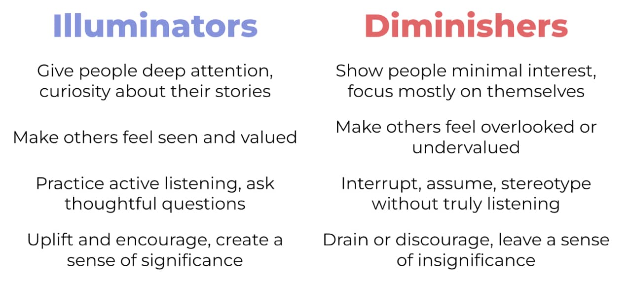Illuminators make others feel bigger, not smaller. People leave conversations feeling understood, respected, and energized. They create an environment where people feel invited into creating something better.