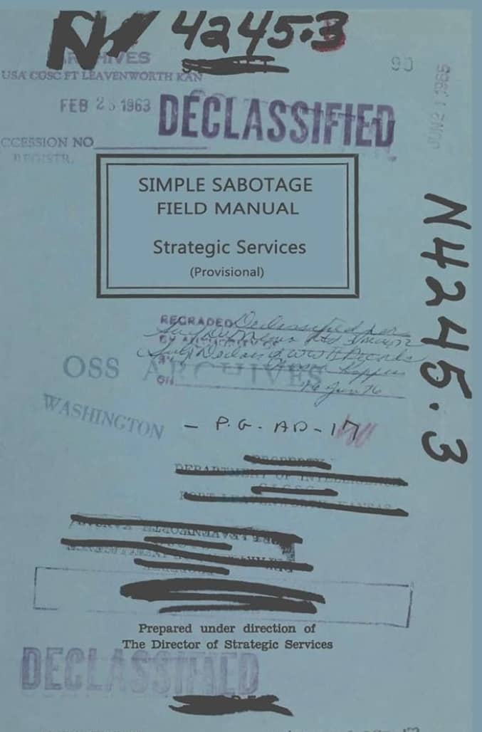 In 1944, the Office of Strategic Services, the precursor to the Central Intelligence Agency, published a document called the Simple Sabotage Field Manual.