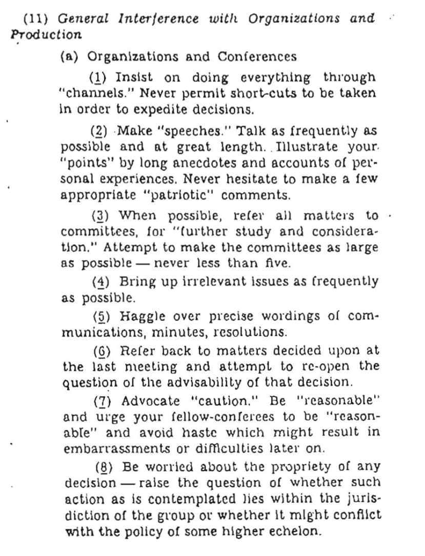 It was not written for trained operatives, but for ordinary citizens living in enemy-controlled territories during World War II. The goal was to help everyday people disrupt organizations from the inside. Rather than relying on dramatic acts of destruction, the manual focused on small, consistent behaviors that would quietly reduce efficiency, create confusion, and weaken performance over time.