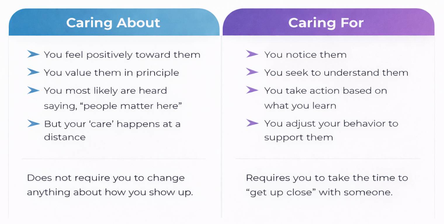 People can sense the difference between a leader who generally cares about them and a leader who consistently demonstrates care for them. Caring about people often shows up in how leaders talk about their teams. Caring for people shows up in how leaders pay attention to their teams and then act on what they need to be successful.