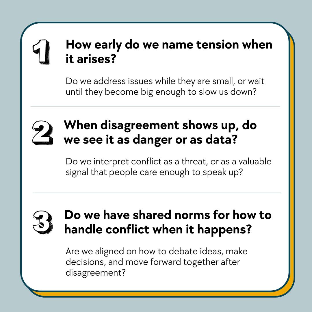 These questions are not meant to point out weakness, but to invite intention. When a team can name tension, stay connected through it, and move forward with shared understanding, it turns conflict from a drain into a driver of performance. So, if you think your team has room to grow in how it handles conflict, start with these three questions and then run an experiment or two that can help you to feel some momentum.